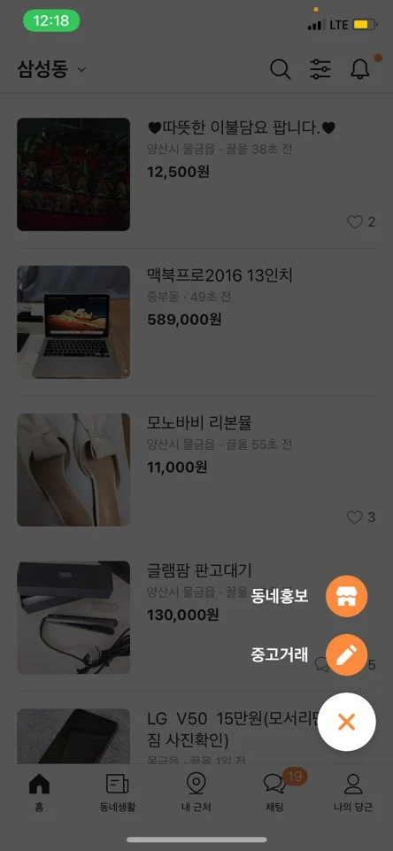 1. 하단의 '+'버튼을 누른 뒤 중고거래를 선택합니다.